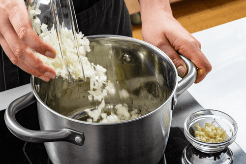 В большой кастрюле разогреть смесь оливкового и растительного масла. Обжарить лук до прозрачности, затем добавить чеснок и жарить, помешивая, еще 30 секунд, до появления яркого аромата.
