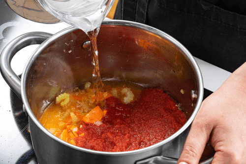 Добавить в кастрюлю помидоры в собственном соку, влить воду и довести до кипения.