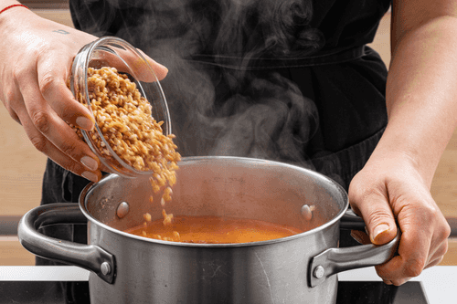 Засыпать полбу в кипящий бульон, уменьшить огонь и варить на медленном огне около 30 минут до мягкости зерна.