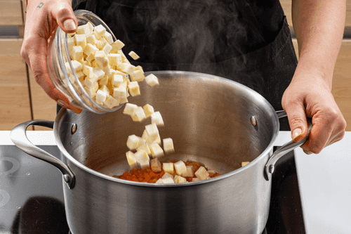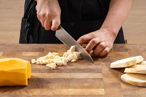 Корень сельдерея и тыкву очистить и нарезать кубиками со стороной 1,5–2 см.
