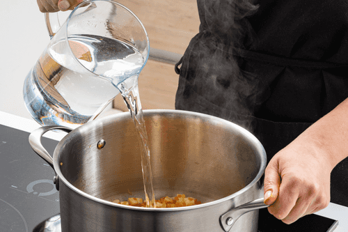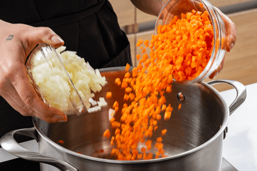 В кастрюлю влить растительное масло и обжарить лук и морковь, помешивая, до прозрачности лука.
