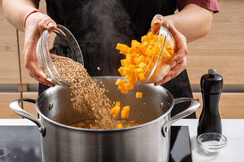 Всыпать гречку, добавить кубики тыквы, снова довести до кипения и варить около 15 минут, до готовности гречки и овощей. Посолить и поперчить по вкусу.