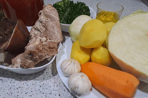Борщ с копченым салом на свиных ребрах