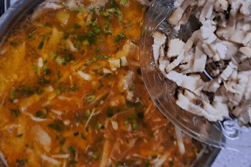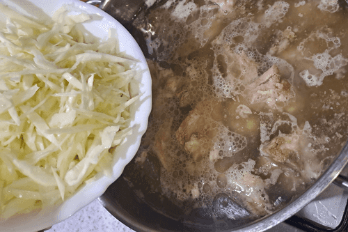 В кастрюлю с готовым бульоном выложить мясо. Капусту вымыть, нарезать тонкой соломкой, выложить в кастрюлю.