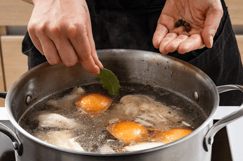 Разрезать пополам 1 луковицу и 1 морковь. Добавить к бульону вместе с душистым перцем и лавровым листом. Варить бульон 1,5 часа на слабом огне.