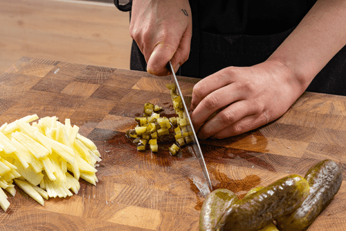 Картофель нарезать соломкой. Соленые огурцы нарезать мелкими кубиками.