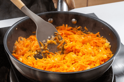 В сковороде разогреть растительное масло и обжарить на нем лук и морковь.