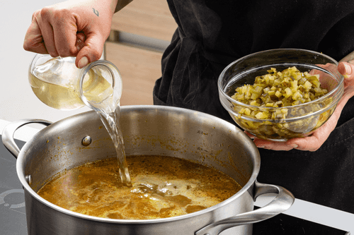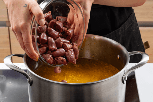 Процедить бульон. Добавить в него зажарку, перловку, картофель и сердечки. Варить до готовности картофеля, около 10 минут.
