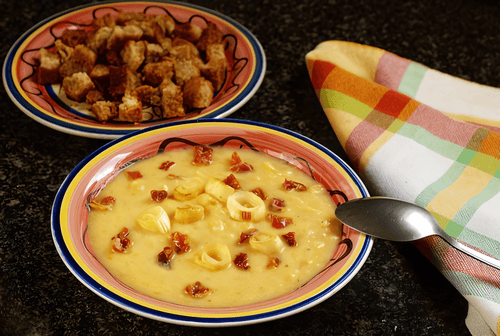 Нарезать шпик ломтиками и обжарить с измельченным репчатым луком. Добавить в бульон и варить еще 5 минут. Посолить.