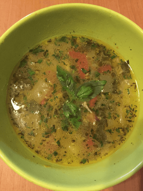 Варить полчаса, попробовать, посолить, поперчить, добавить нарезанные кубиками картофель, кабачки и помидоры, поварить еще десять минут, добавить зеленый горошек и варить еще три минуты. Всыпать с сотейник мелко нарубленный базилик, смешанный с горгонзолой, дать три минуты постоять — и разлить по тарелкам.