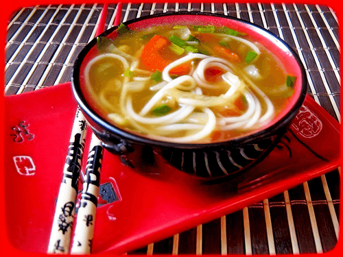 Луковый суп с рисовой лапшой и соевым соусом