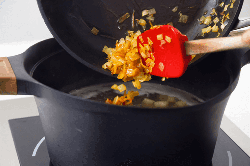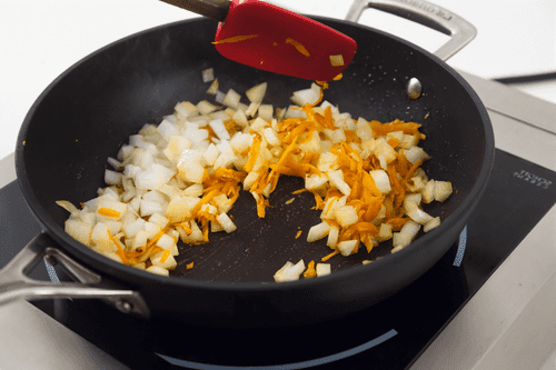 Морковь очистить и натереть на крупной терке, лук нарезать кубиками. На разогретую сковороду налить растительное масло и пассеровать морковь и лук на сильном огне до золотистого цвета, не забывая помешивать.