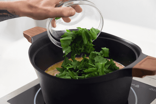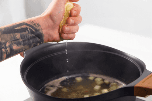 Как только картошка дойдет до готовности, выжать в суп немного лимонного сока — понадобится примерно 10 мл, но количество можно варьировать в зависимости от кислоты самого щавеля.