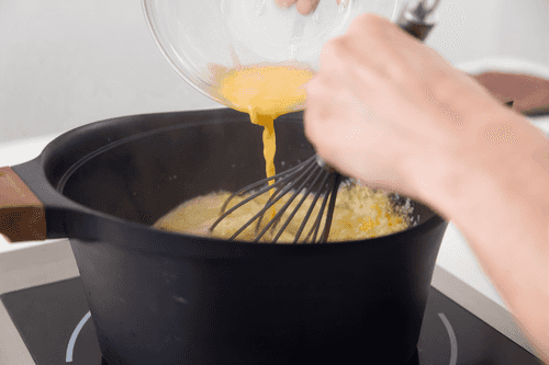 Пока картошка отваривается в бульоне (это займет примерно десять-пятнадцать минут — она должна стать мягкой), разбить в миску три яйца и слегка взбить их венчиком до однородной консистенции.