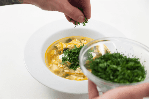 Добавить в суп нарезанный щавель, перемешать и дать ему немного увариться — максимум пять минут, затем еще раз перемешать и снять кастрюлю с огня. Отделить зелень петрушки и укропа от стеблей, листья мелко нарезать.
