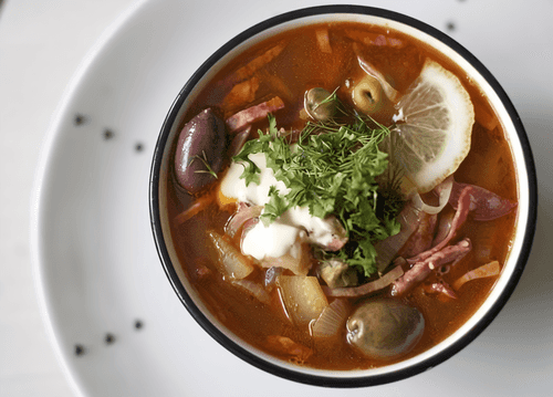 Мясная солянка с каперсами и солеными огурцами