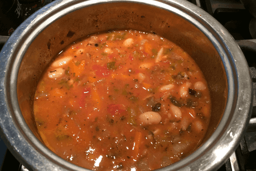 Добавьте лук, морковь, орегано и резанные помидоры в собственном соку к супу и варите на медленном огне около от 1 до 1,5 часов. До готовности фасоли.