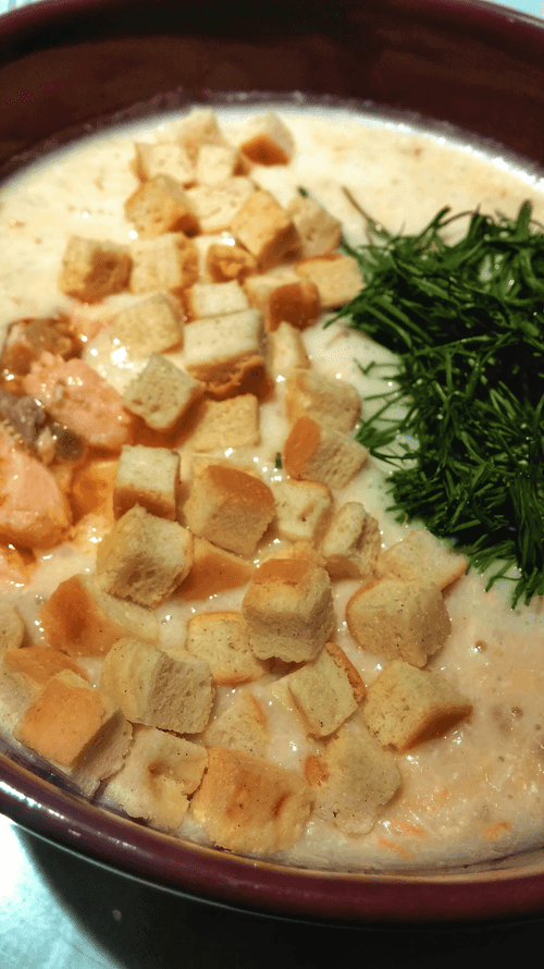 Получившийся суп измельчаем в блендере. Разливаем по тарелкам, украшаем мелко нарезанным укропом, крутонами и по желанию кусочками обжаренного лосося. Приятного аппетита!