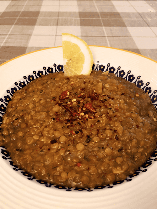 Когда чечевица слегка разварится и будет почти готова добавить в кастрюлю сушеную мяту, поварить еще 5 минут, затем посолить, выжать сок половинки лимона, добавить молотую паприку, зиру и турмерик, слегка размять чечевицу в кастрюле толкушкой, и оставить настояться 10 минут