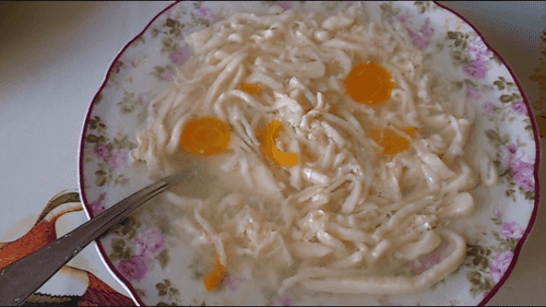 Включить огонь, положить лапшу в бульон, разбить три яйца в чашку и размешать. После всплытия лапши (обычно минут через семь, на медленном огне) влить яйца в кастрюлю и по истечении 2-3 минут погасить огонь.