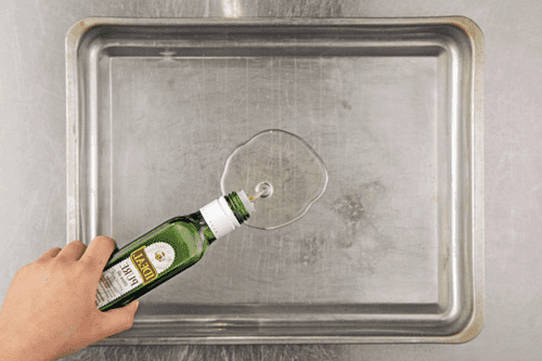 Разогреть духовку до 220 °С. Налить 4 столовые ложки оливкового масла в форму для запекания и прогреть в духовке почти до дымка.