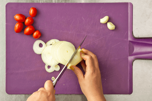 Лук тонко нарезать кольцами. Помидоры разрезать пополам.