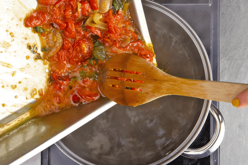 Переложить печеные помидоры с добавками в сотейник, грубые стебли тимьяна и черешки базилика удалить.