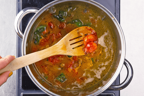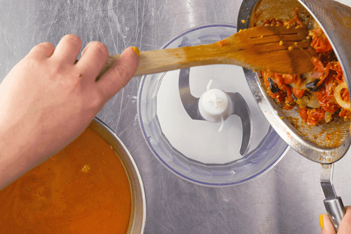 Процедить бульон, помидоры переложить в блендер или кухонный комбайн и измельчить, постепенно добавляя бульон, до консистенции нежного бархатистого пюре. Протереть через сито в чистую кастрюлю или миску. Попробовать на соль и перец.