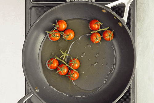 Для украшения супа нагреть 2 столовых ложки оливкового масла в сковороде. Разделить кистевые помидорчики на 4 небольшие грозди и обжарить их все целиком примерно в течение минуты.