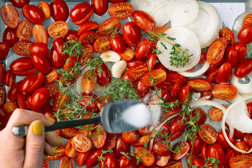 Аккуратно выложить в масло помидоры, кольца лука, тонко нарезанный чеснок, перемешать. Присыпать ветками тимьяна, сахаром, хорошо посолить и поперчить. Запекать в духовке 20-25 минут до образования красивой корочки, перемешав один или два раза в процессе приготовления, а ближе к концу добавив базилик.