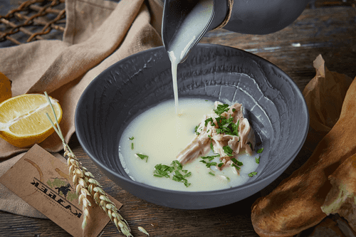 К этому времени бульон готов, охлаждаем его совсем чуть-чуть и понемногу добавляем горячий бульон в миску с желтком и уксусом, а потом, когда согреется эта смесь, её обратно выливаем в бульон, чтобы не было резкого перепада температуры.
