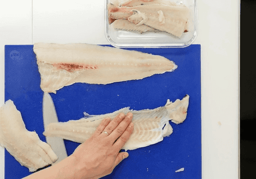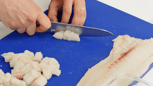 Разделать треску на филе, удалить кожу. Филе трески нарезать небольшими кусочками на один укус, удалив кости, если они есть.
