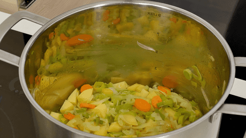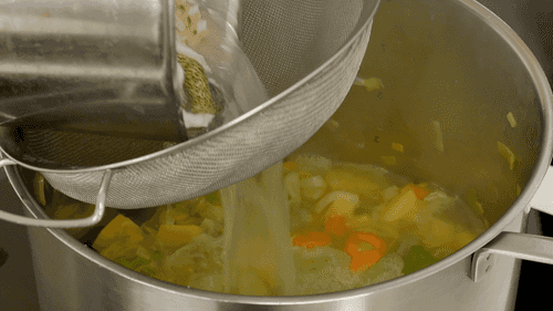 Залить овощи процеженным рыбным бульоном так, чтобы он их покрывал. Если бульона не хватает, можно добавить воду. Накрыть крышкой и варить 10 минут.