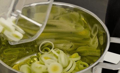 Нарезать лук соломкой, а лук-порей толстыми кольцами, у порея использовать не только белую часть, но и зеленую до листьев.