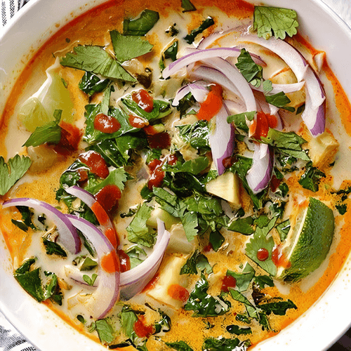 Тайский овощной суп с карри — это гармония пряных и насыщенных вкусов, воплощающая богатство тайской кухни. Этот ароматный суп уходит корнями в традиции уличной еды Таиланда, где специи, свежие травы и кокосовые сливки создают незабываемый гастрономический опыт. Нежная рисовая лапша, пропитанная согревающим карри, сочетается с сладостью кокосовых сливок и легкой кислинкой лайма. Рыбный соус добавляет глубину, а кинза и шрирача — свежесть и пикантность. Этот суп не только согревает в прохладный день, но и пробуждает желание исследовать гастрономические традиции Тайланда. Он идеально подходит как легкий ужин, который приносит утешение и наслаждение в каждом глотке.