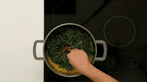 Добавить кейл, нарезанный тонкой соломкой, и варить на небольшом огне до готовности кейла — около 5 минут.