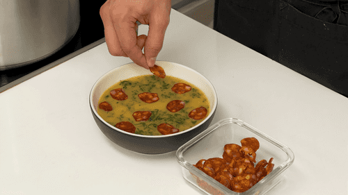 Подавать суп в глубокой миске с кусочками чоризо.
