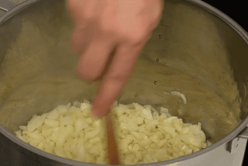 Обжарить нарезанный лук и зубчик чеснока до мягкости.