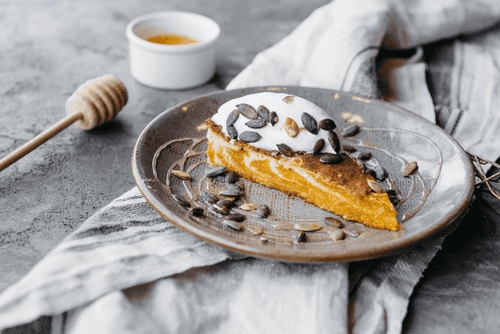 При подаче, пирог сервировать медом и шариком ванильного мороженого.