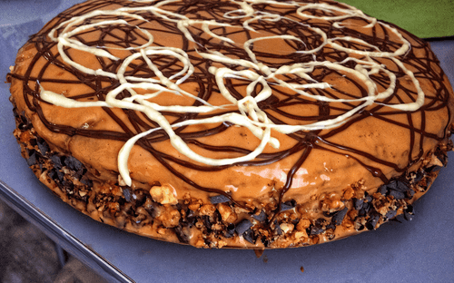 Теперь берем грецкие орехи, измельчаем , но не слишком сильно, и обсыпаем по бокам . Далее следует растопить шоколад, я это делаю с помощью обычного маленького пакетика, потом кладем в кружку с кипятком, как шоколад будет готов делаем маленькую дырочку, и круговыми движениями поливаем вверх торта. Шоколад топим по отдельности. Еще для украшения я брала шоколадную стружку, ну это пожеланию.
