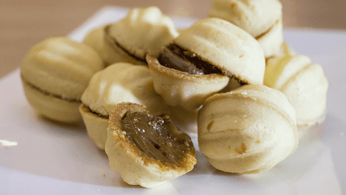 Шарики выпекать примерно 2-3 минуты с каждой стороны до красивого золотистого цвета. Затем каждую половинку начинить начинкой. Половинки соединить и можно подавать.