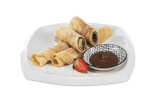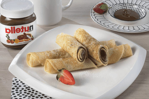 Готовые блины свернуть в трубочку, разрезать каждую пополам, чтобы удобно было брать. Подавать с Nutella®.