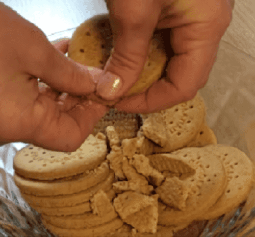 Разломать печенье на небольшие кусочки и смешать с измельченным фундуком.