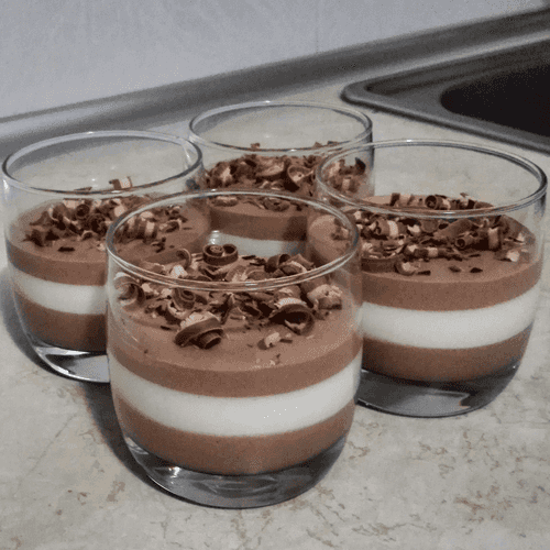 Взять бокал, налить часть шоколадной массы, поставить в холодильник минут на 15, чтобы она загустела, затем влить в бокал молочную массу, снова поставить в холодильник. После загустения второго слоя вылить снова шоколадную массу и поставить в холодильник.