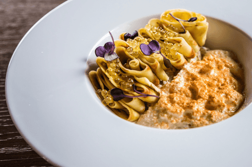 Блины с муссом из копченого лосося и маринованным огурцом — это изысканный шедевр авторской кухни, сочетающий нежность и насыщенность вкусов. Хрустящие золотистые блины служат основой для воздушного мусса из копченого лосося, который приобретает бархатистую текстуру благодаря сливкам и желатину. Маринованный огурец и яблочный тартар добавляют свежие, хрустящие нотки, а эстрагоновое масло и сметанный соус гармонично объединяют ингредиенты в единое гастрономическое наслаждение. Завершающий штрих — икра дикого лосося, придающая блюду утонченность и легкую соленую пикантность. Это блюдо идеально подходит для особых случаев, где требуется утонченное сочетание текстур и вкусов, создающее настоящий праздник для гурманов.