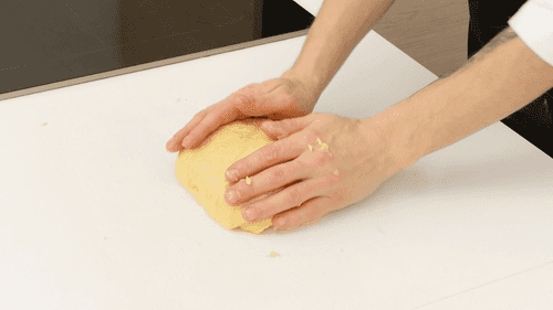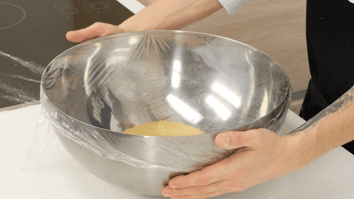 Слегка присыпать рабочую поверхность мукой и обмять поднявшееся тесто, снова придать ему форму шара, положить в чашу, накрыть пленкой и вернуть в теплое место еще на час. После чего убрать в холодильник на несколько часов, а лучше на ночь.