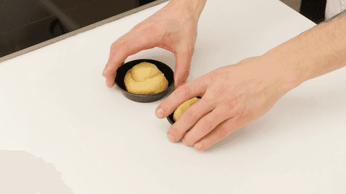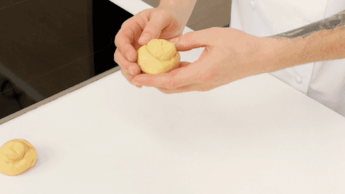 Расстоявшееся тесто разделить на 16 равных частей, накрыть их пленкой, чтобы они не засохли. Взять одну часть теста, аккуратно сформовать из нее шар. Затем положить руку на тесто (как это делают каратисты, разбивающие кирпич) и покатать шар, как бы разделяя его на две неравные части. Кусок теста должен выглядеть как голова и тело, соединенные длинной шеей. Проделать в «теле» теста широкое отверстие, и просунуть в него «голову», выровнять булочку руками и уложить ее в форму. Проделать то же в остальными пятнадцатью частями.