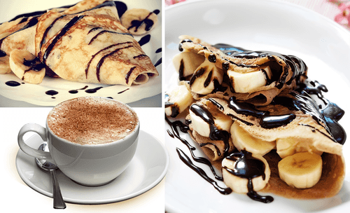 Когда блины будут готовы, можно взять еще 1–2 банана, нарезать тонкими кольцами и завернуть в блины, сверху полить сгущенкой и посыпать какао либо шоколадом.
