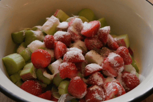 Ревень очистить, нарезать кусочками толщиной в сантиметр, клубнику разрезать напополам. Перемешать с 80 граммами сахара, кардамоном и крахмалом.