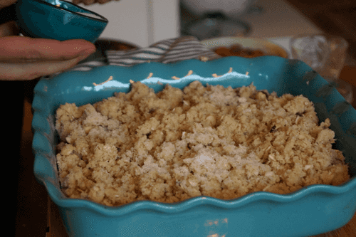 Взбить сметану с сахарной пудрой, желтками, цедрой и ванилью. Подавать теплый крамбл со сметанным соусом.